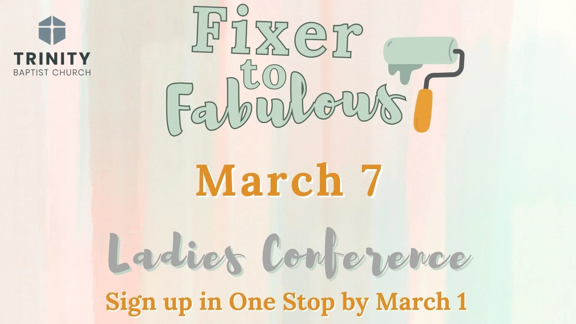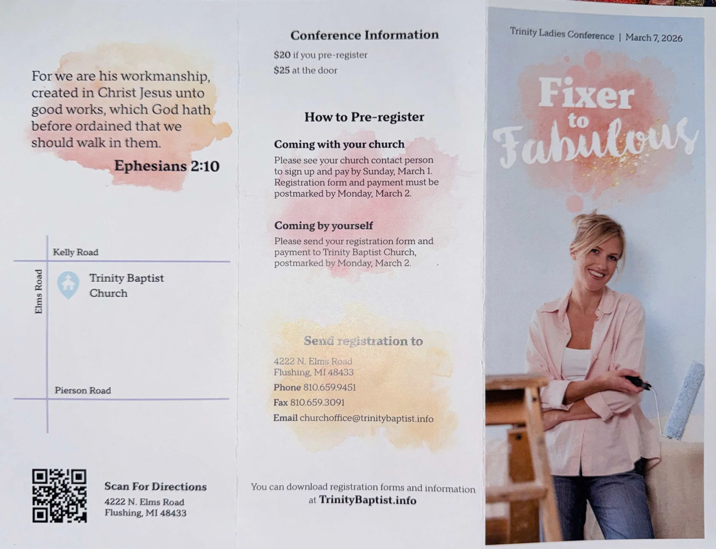 Back to All Events 2026 Trinity Ladies Conference Fixer to Fabulous Saturday, March 7, 2026 7:00 AM 3:00 PM Trinity Baptist Church 4222 Elms Road Flushing, MI, 48433 United States (map) Google Calendar ICS View fullsize View fullsize